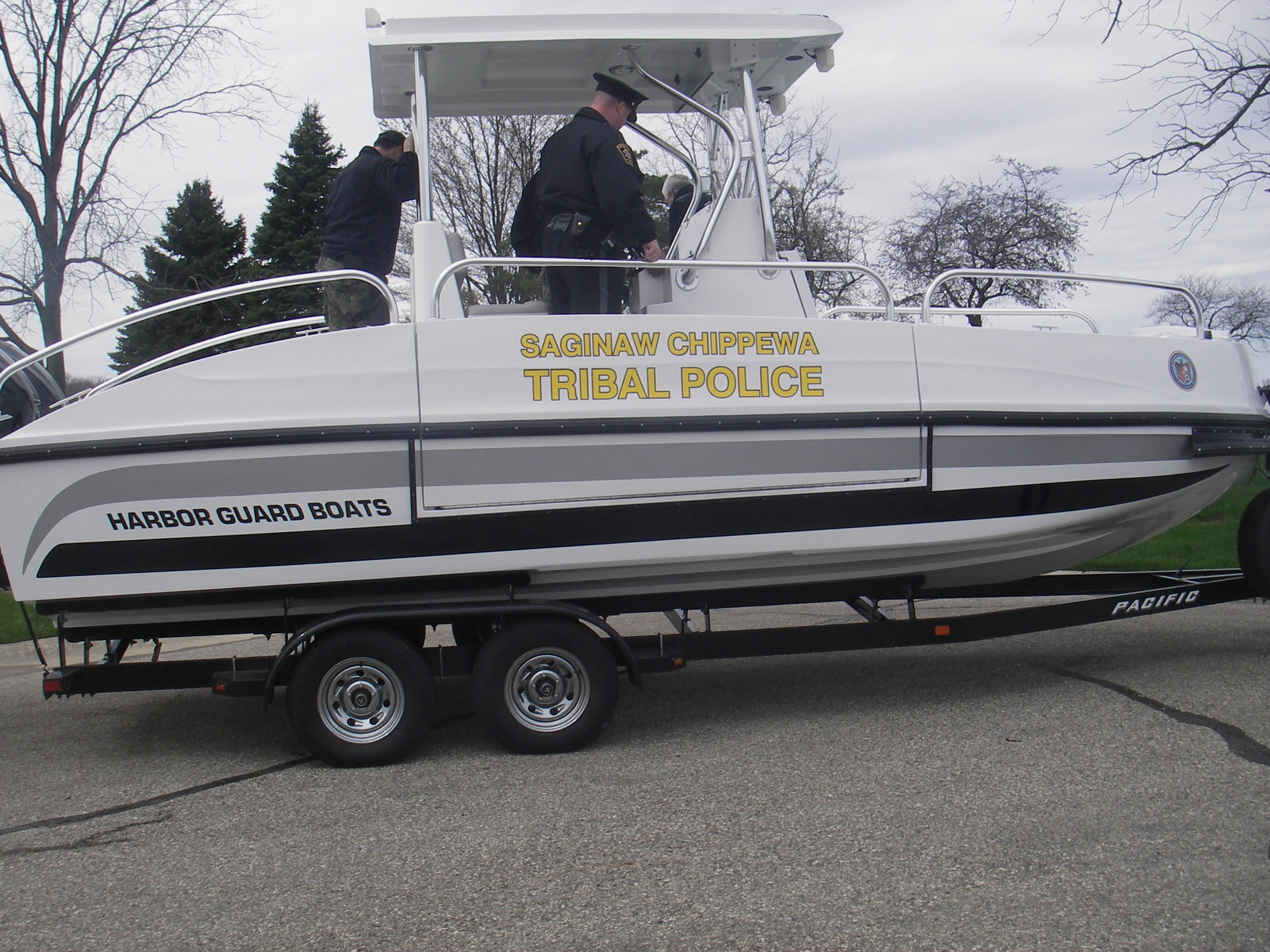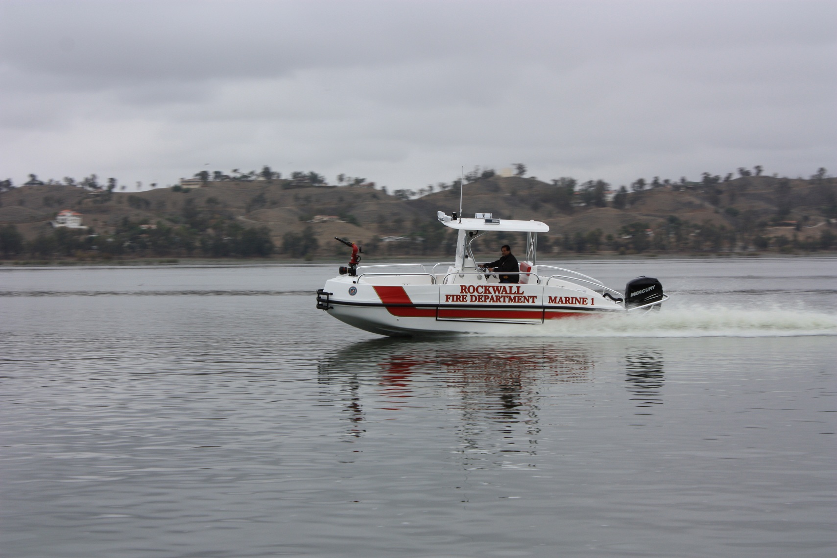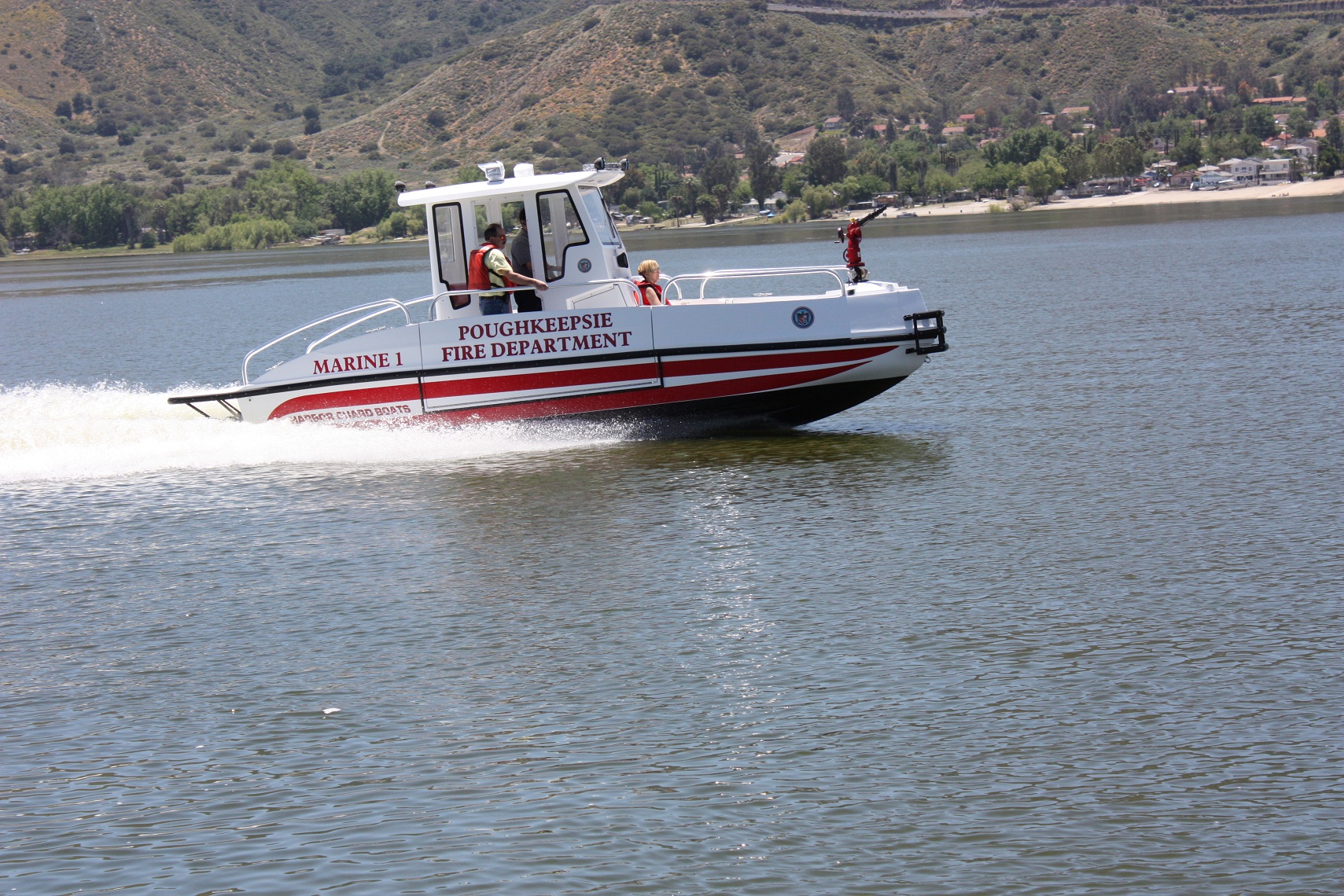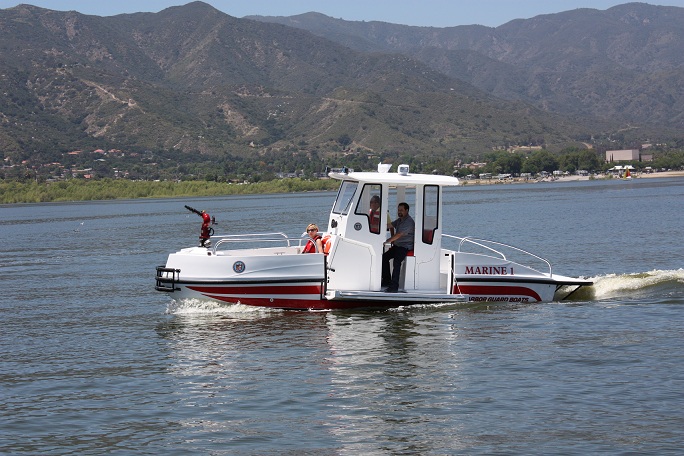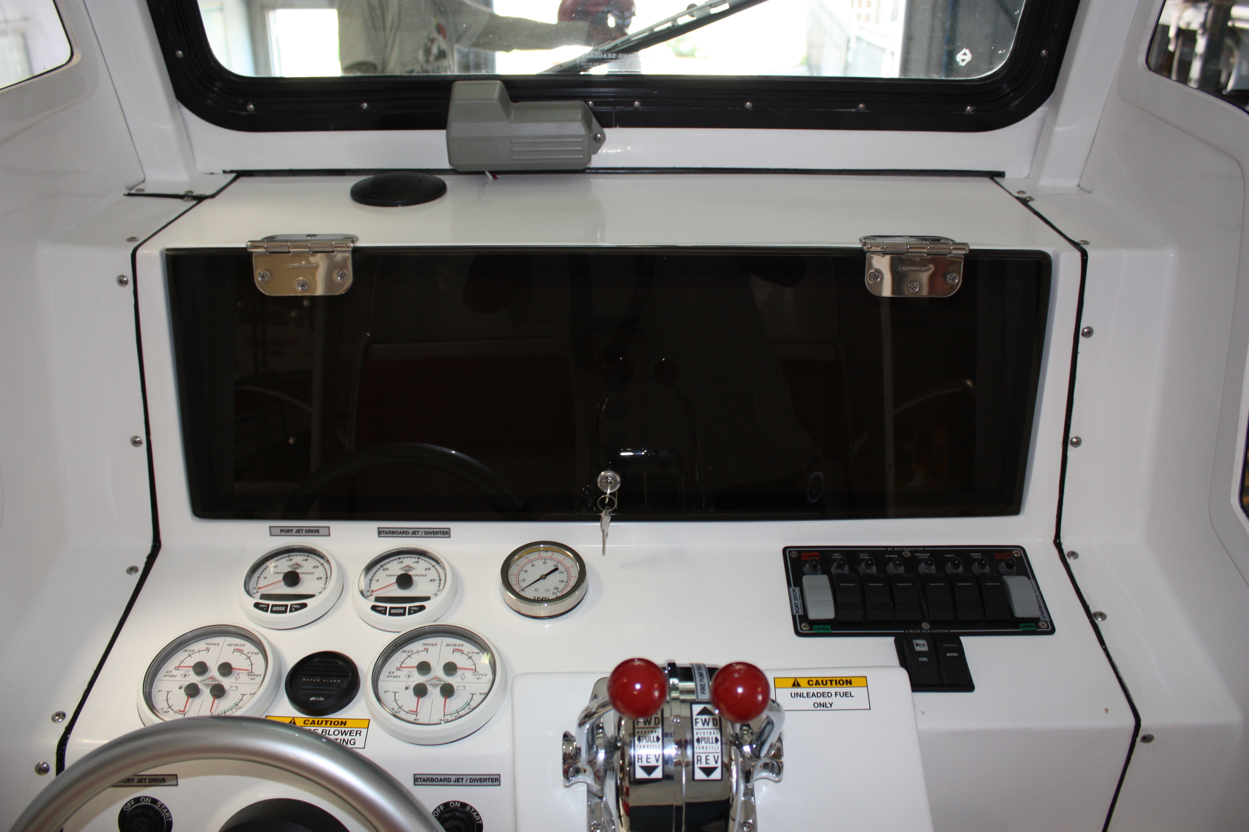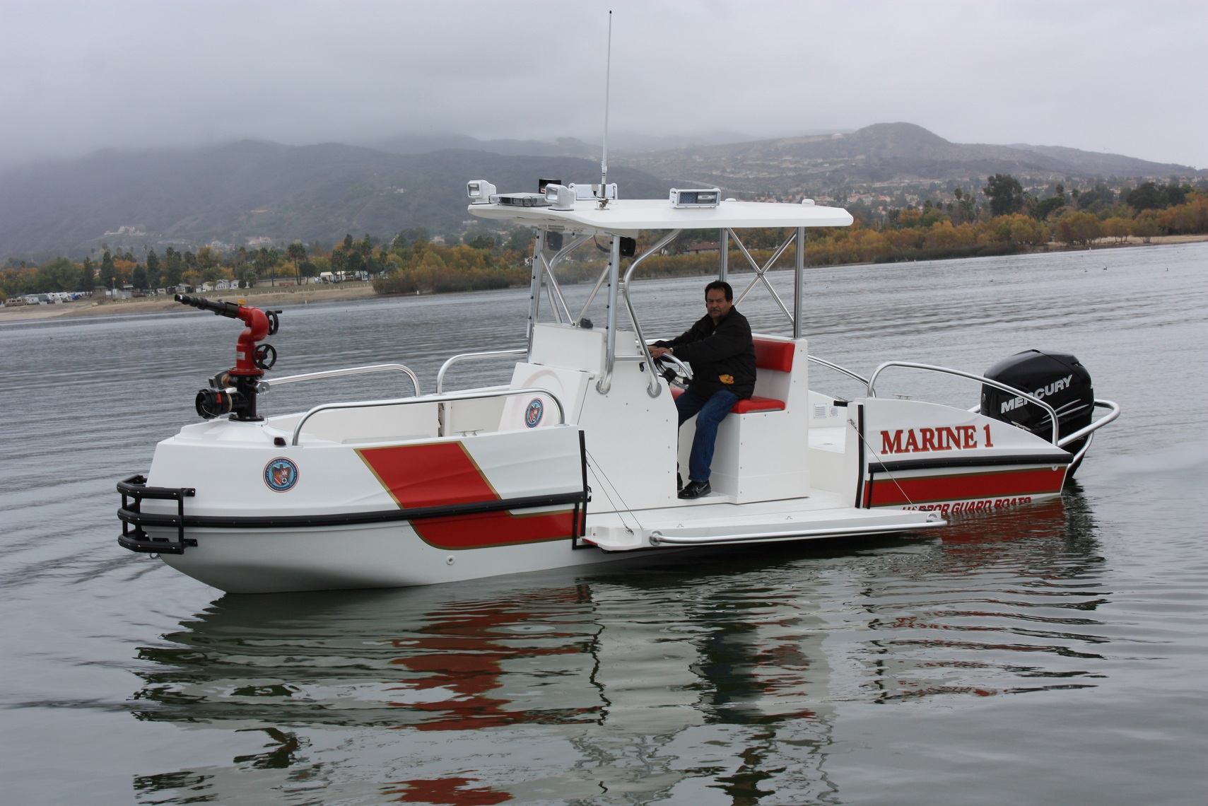 The FIREHAWK (Fire model) also provides a 1500 GPM jet fire pump and bow mounted fire monitor for fire suppression (water and foam) and "pump out" capabilities. The below deck fire pump is directly plumbed through the keel. The pump is always primed and can supply water with a turn of a key.