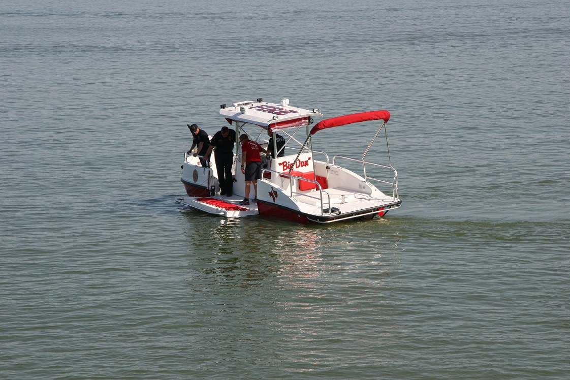 Product Highlights and Innovations: Patented - Dual 8' collapsible dive platform doors. These doors are electrically controlled from the drivers helm with a manual override. The doors (foam filled) float on the waterline when completely lowered providing multiple patient access in a rescue situation. These doors also provide an unmatched flat waterline platform for dive , rescue and recovery missions.