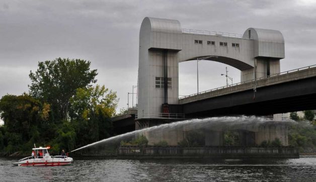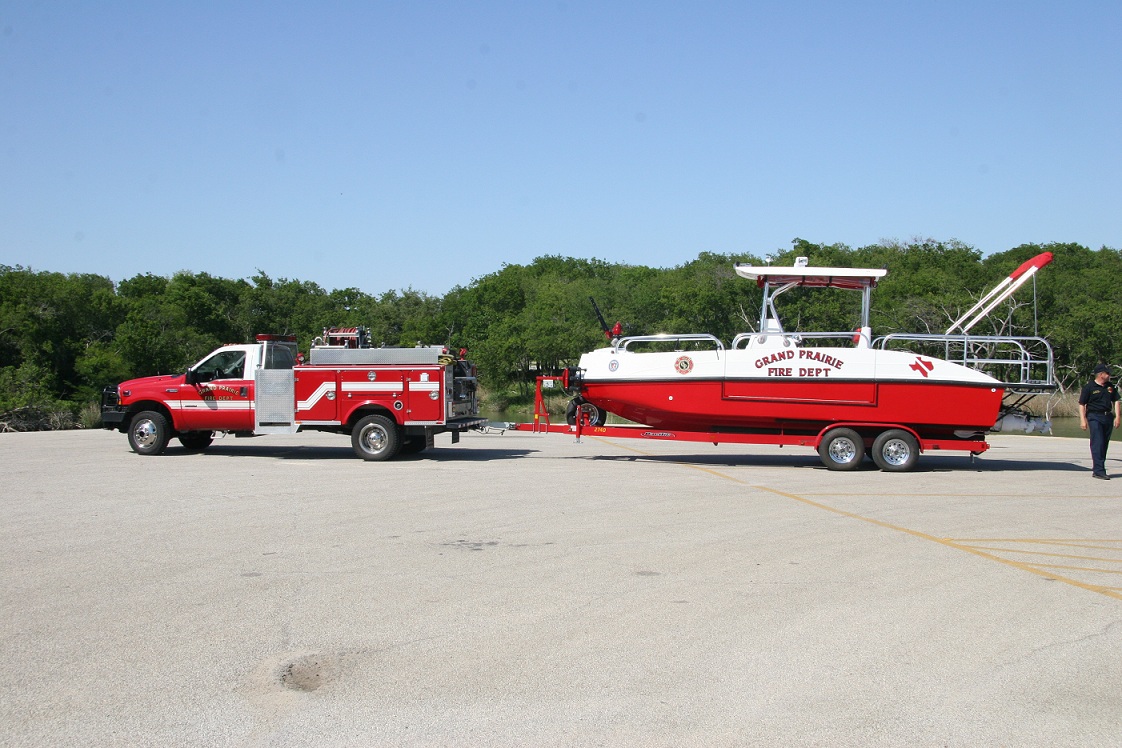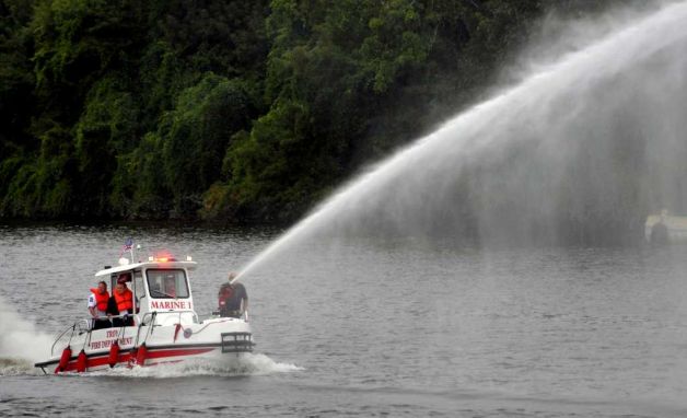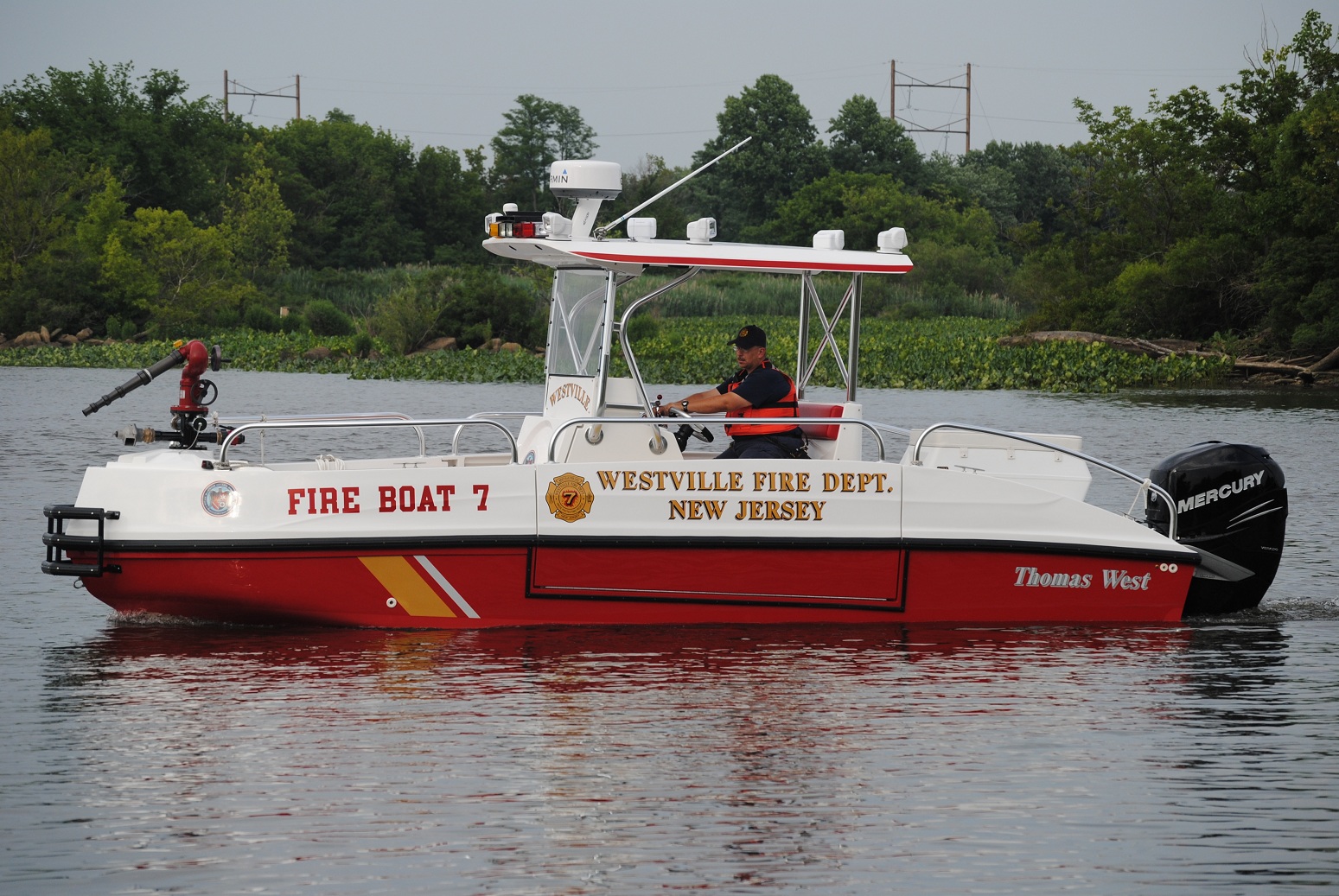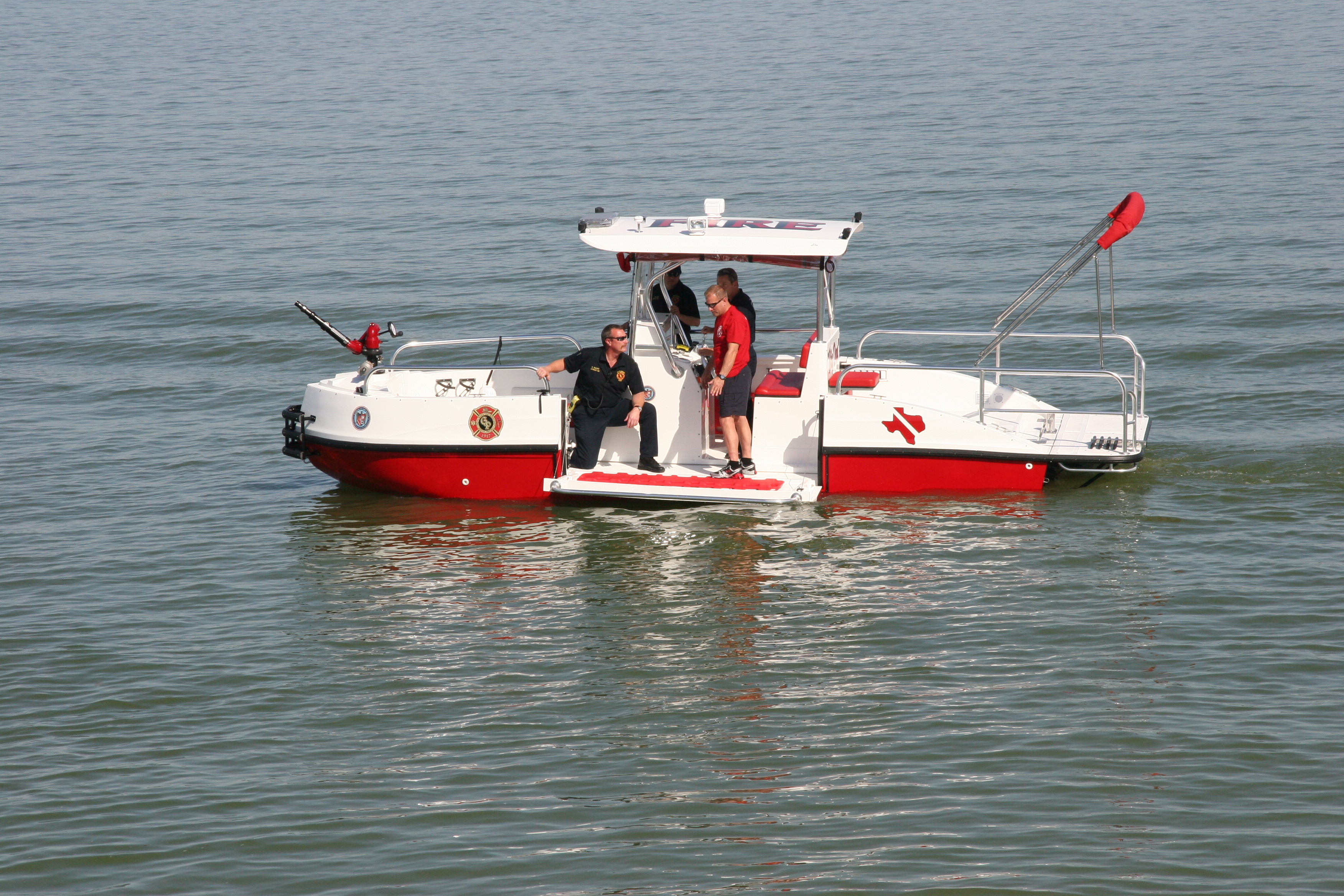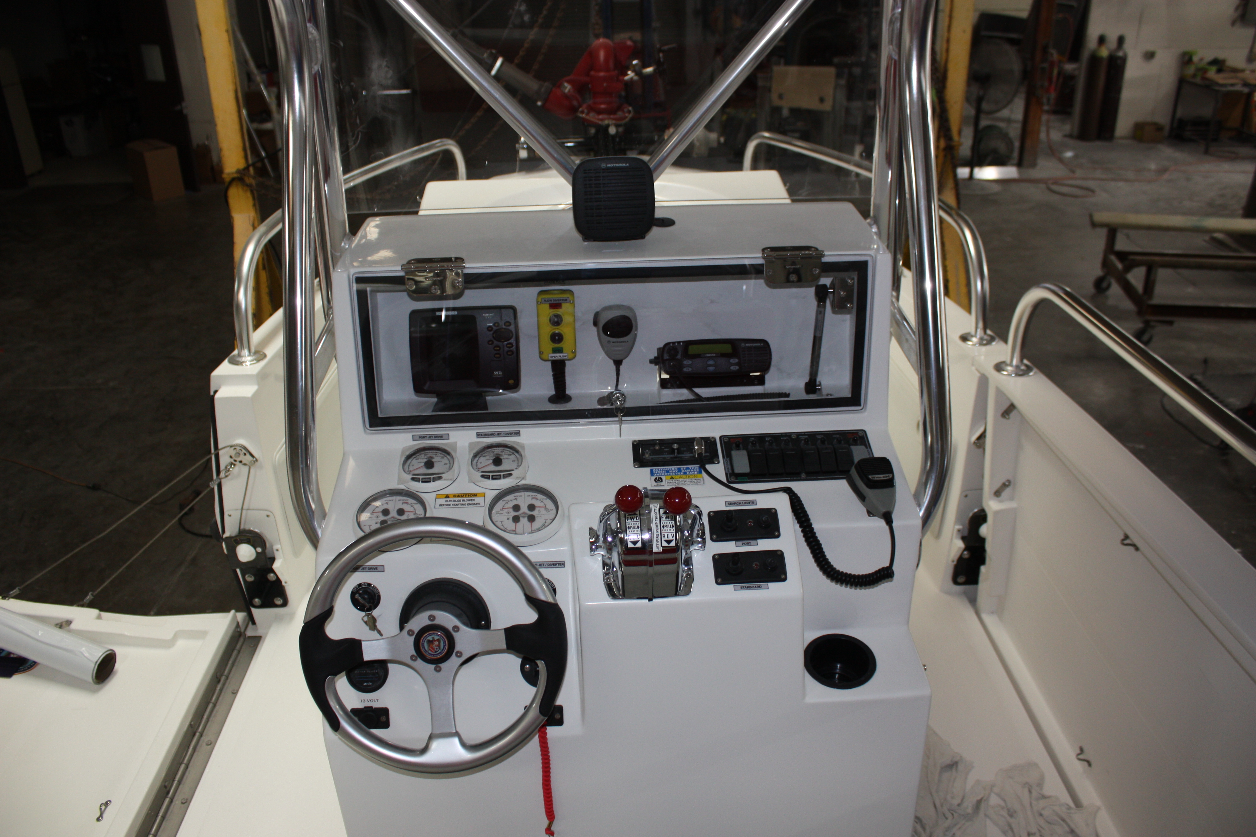 Twin V8 Jet drives can also be installed One jet drive would be utilized for fire suppression , diverting 100% of flow to the deck monitor. Flow is 1500 GPM. The second jet drive is used to keep the boat on station and to manuever while flowing water.